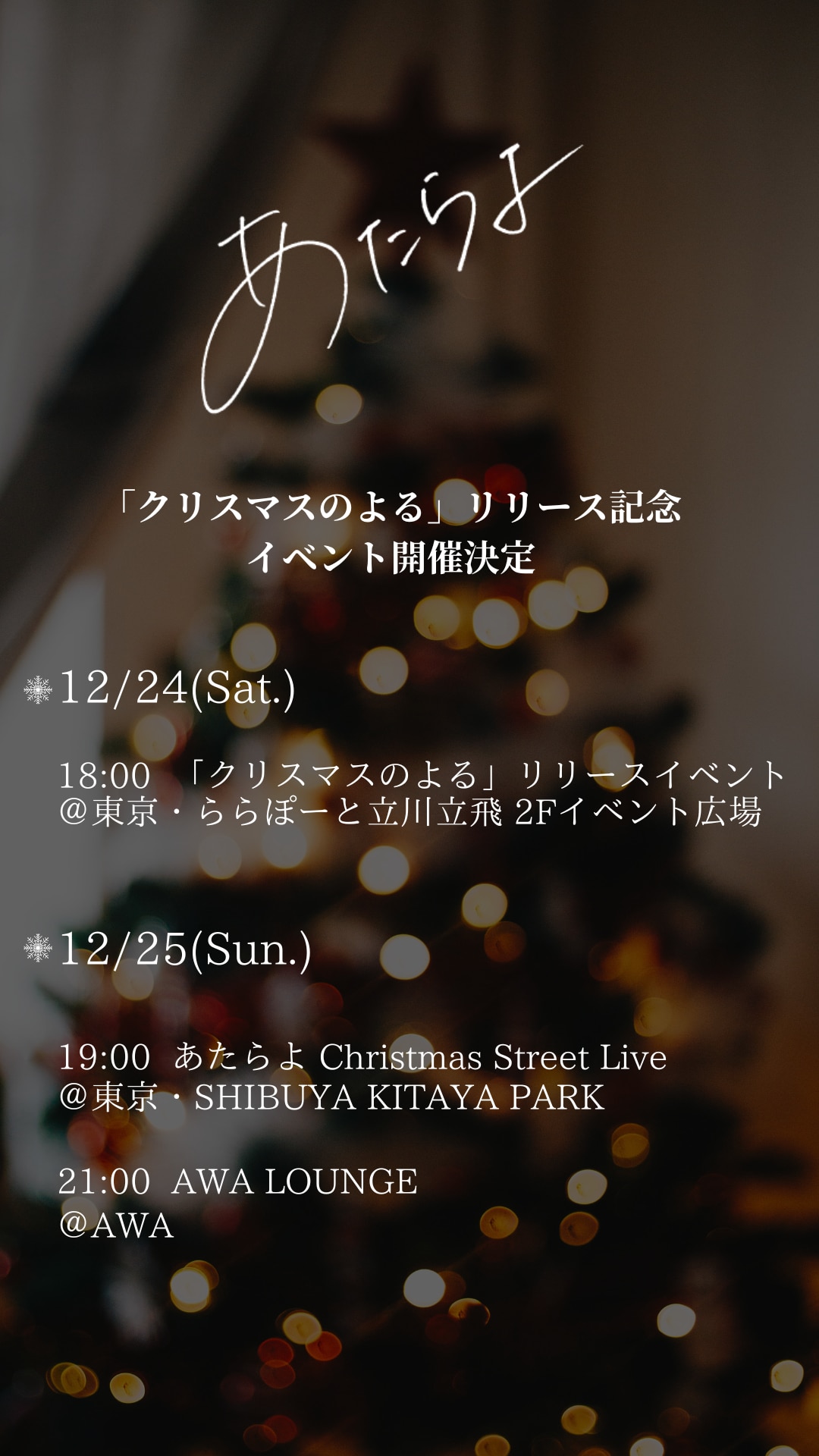 今作「クリスマスのよる」は、“ひとりぼっちのクリスマス”に思いに耽る、ミッドバラードナンバーで、あたらよ初のクリスマスソングとなっています。本日、「クリスマスのよる」のリリースを記念して、12/24クリスマスイブ・12/25クリスマス当日に3つのイベントを開催決定!